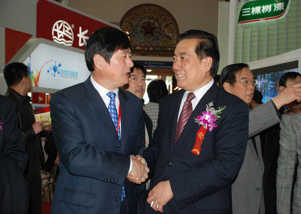 会展上,中国石化联合会会长李勇武(左二)与公司董事长包天雄(左一)亲切交谈。