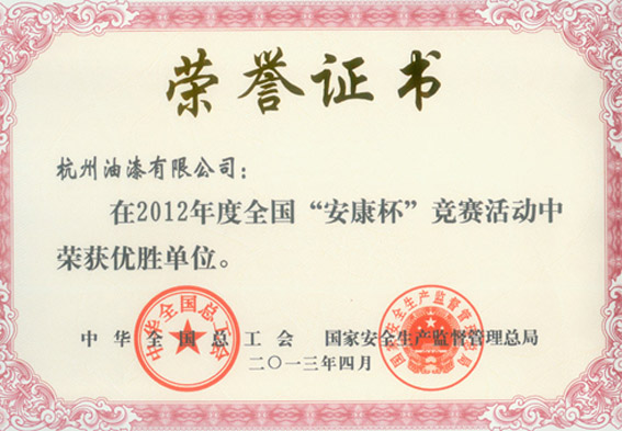 近日,在全国安康杯竞赛组织委员会下发的《关于2012年度全国“安康杯”竞赛先进集体和优秀个人审核情况通报》中,我杭州油漆有限公司在2012年度全国“安康杯”竞赛活动中再取佳绩,被中华全国总工会和国家安全监督管理局联合授予2012年度全国“安康杯”竞赛优胜单位,这是公司连续第六年获此殊荣。
